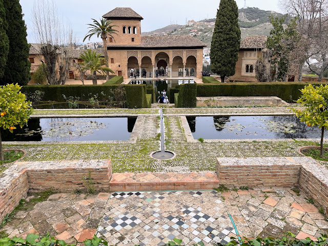 Tein suomalaisryhmän kanssa bussiretken Alhambran palatsiin Granadaan. Vierailin palatsialueella ensimmäisen kerran parikymmentä vuotta sitten, mistä muistan lähinnä pitsikoristeiset seinät, sirot pylvässalit ja kymmenet vesialtaat. Samoilla sanoilla kuvailisin aluetta tänäkin päivänä - ehkä kuitenkin lisäisin listaan sanan turistijonot.