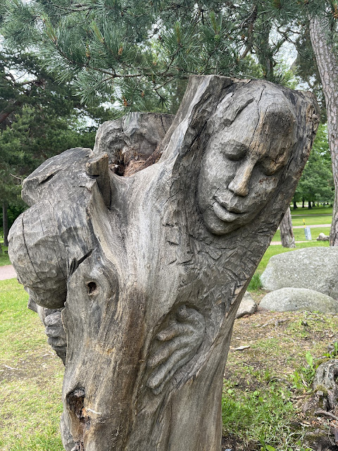 Ilmeisesti puuveistokset ovat olleet puistossa pidempään, mutta tämä oli eka kerta kun minä ne näin. Ja ihastuin :) Samoin kuin joku vuosi sitten ihastuin Lauttasaaren kartanon puutarhassa useamman vuoden olleeseen Lahopuutarha-nimiseen tilateokseen (täällä).